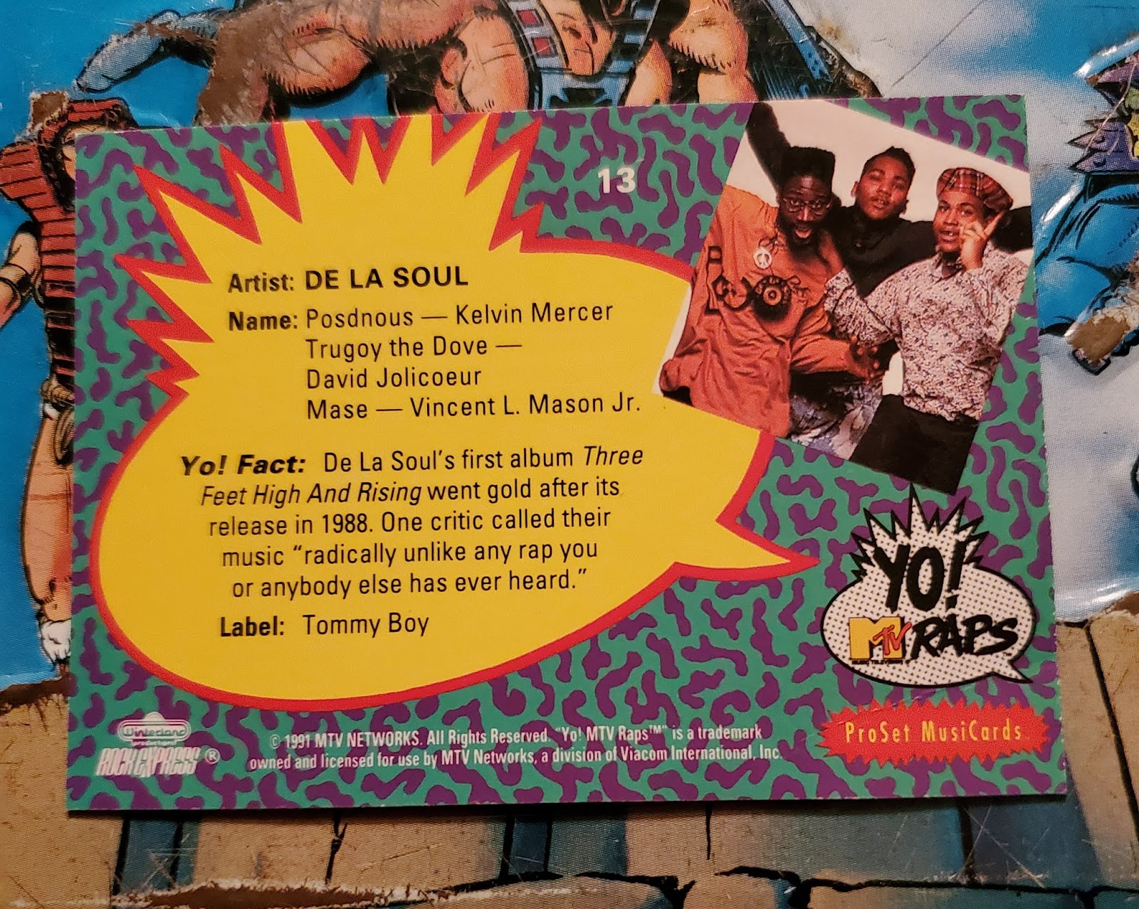 I opened up a pack of Yo! Mtv cards on the last episode of Worlds Famous. I'll link it below. Anyhow I opened up the pack and got this very cool De La Soul Rookie Card.